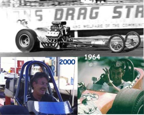 | Here's a shot of the A&W Car running the Ford... Lions 1964(top)!!!!!Bottom left is Walt in the driver seat of "Old Blue" at this years CHRR and bottom right is Walt in the A&W car back in 1964. |