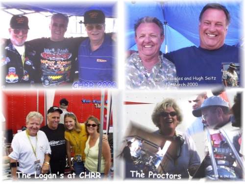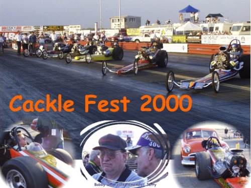 | It was hard for a lay person like myself to begin to understand the magnitude of the emotions and camaraderie that must have been apart of this sport in its' fledgling years. As the tears and memories were flowing I just stood in awh of this amazing site. I was remembering just days before as the Porshe brothers, Brett Johanson, and Nick Arias with the Rattler chassis and Frank with his donated motor together with T-Slick, Bob Downey and Todd Shappee set out to fire up the Rattler. Oh, and me well...I was busy warning the neighbors and chasing parts for the Mastercam car. Later Walt brought over an old video tape called "The Seven Second Love Affair" and we all watched as they remembered the details of the film(ssshhh! you see most of these guys were in this film!)WOW! There was an excitement in the air that cannot be described and that day at the Cackle Fest was no different. I was peeking from the back seat of Steve Gibb's car as the "Cackle Fest 2000" was about to get under way... Now, you see as I understand it the Cackle Fest was started by Steve Gibbs....one day as they were push starting the Roadster and the Bill Pitts Magic Car it occured to Steve that the idea of push starting a couple of old cars might be kinda cool. So he took a look around the museum and realized that they had quite a few cars that would be worthy of running and remembering when cars were push started up to the starting line and just staged and ran. Why not now, that would be great if we could get 8 to 10 cars running at one time. As Steve set about making this all happen he realized that not many people who drag race today have ever seen a car push-started let alone an old style front motor fuel dragster. He made a few calls and the rest is history...the emotional impact it had on everyone involved was beyond Steve's wildest dreams and I think this might have been just the beginnings of something big...something truly wonderful. Rumor has it that there are 20+ cars lined up for Cackle Fest 2001. Stay tuned!!!! |